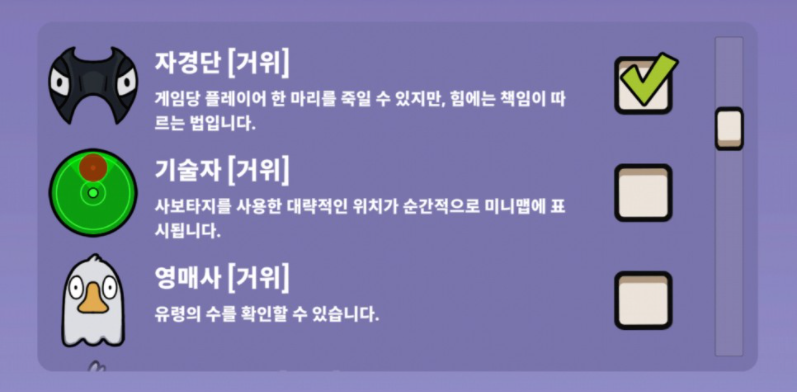 ※ 특히, 투표로 죽으면 승리하는 도도새를 잡는데 꼭 필요한 직업입니다.
