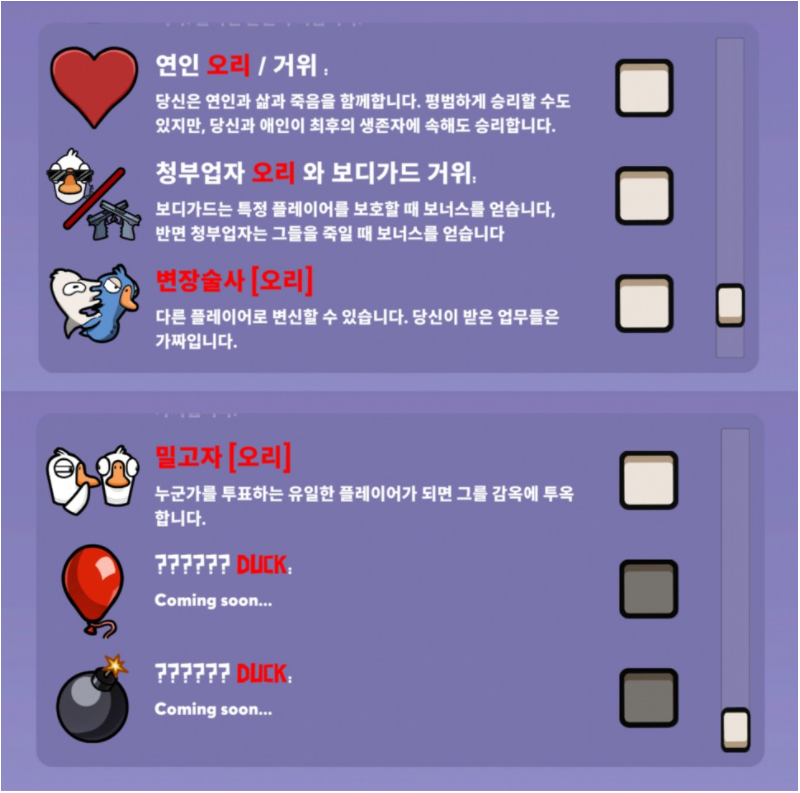 구스구스덕 큰 분류는 일반시민 거위와 마피아 오리로 나뉩니다.